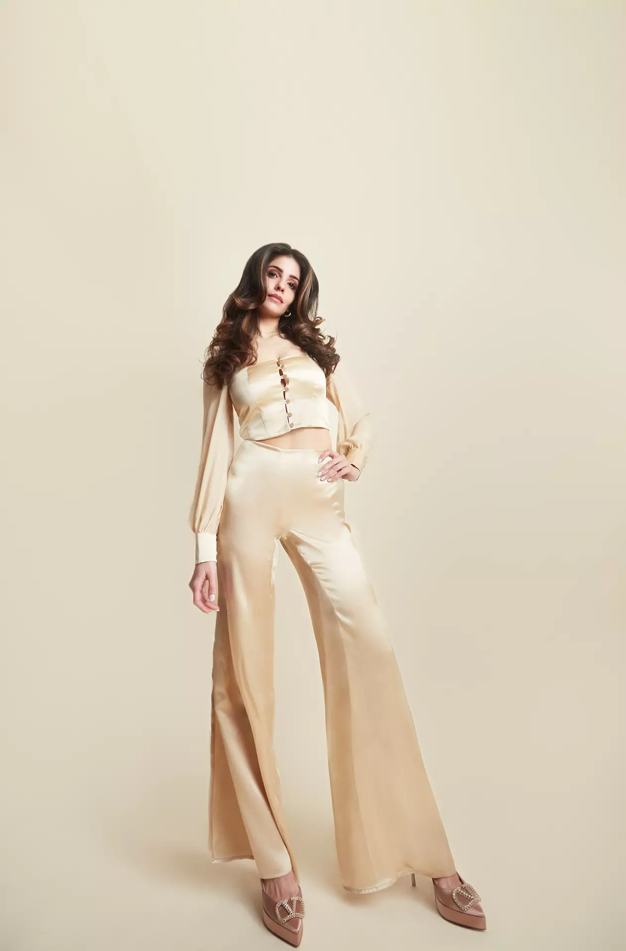 High-waisted design with side slits along the legs for added movement and allure. Loose, flared fit that offers ease and sophistication.
