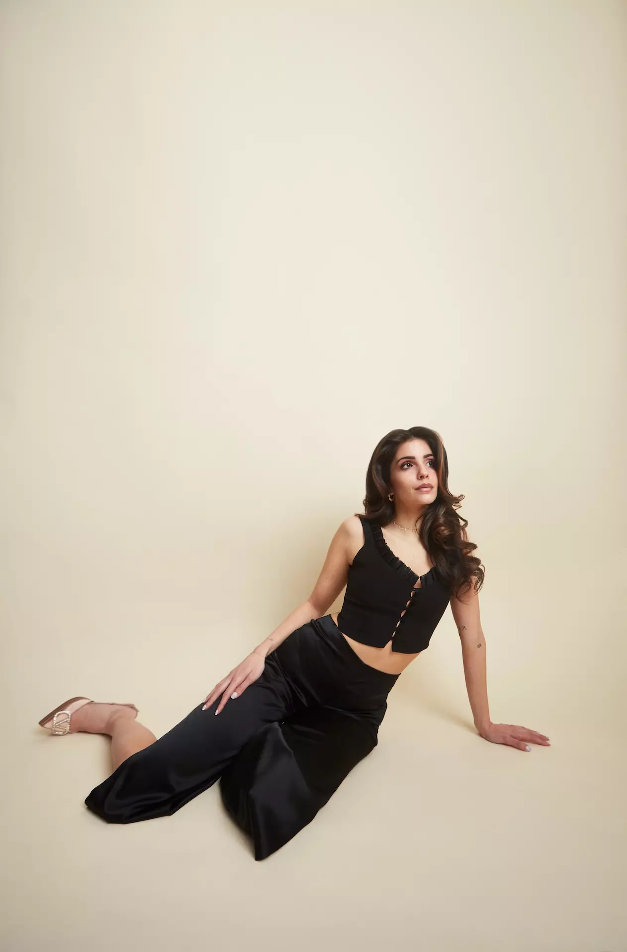 Elegant black bustier made from smooth, satin-finished fabric. Sleeveless with wide ruffled straps. A V-neckline and six covered buttons down the front complete the look. Slightly cropped, it combines chic and modern for semi-formal occasions.