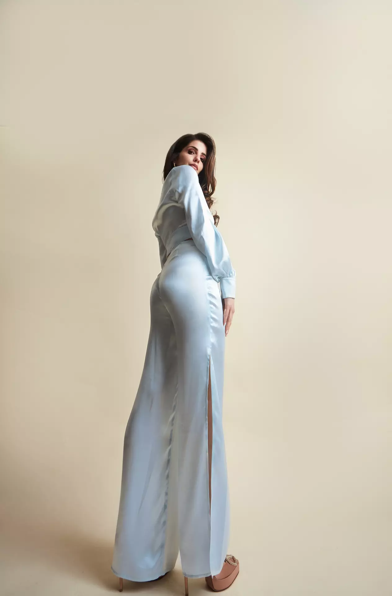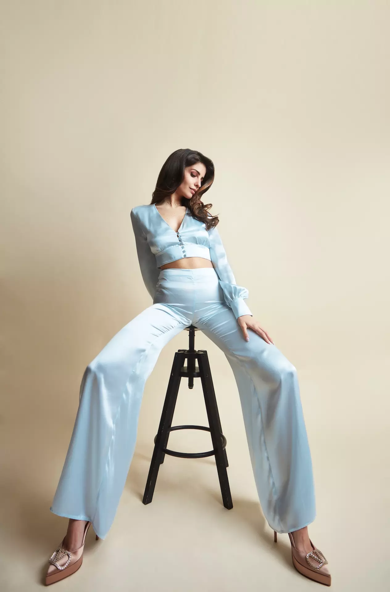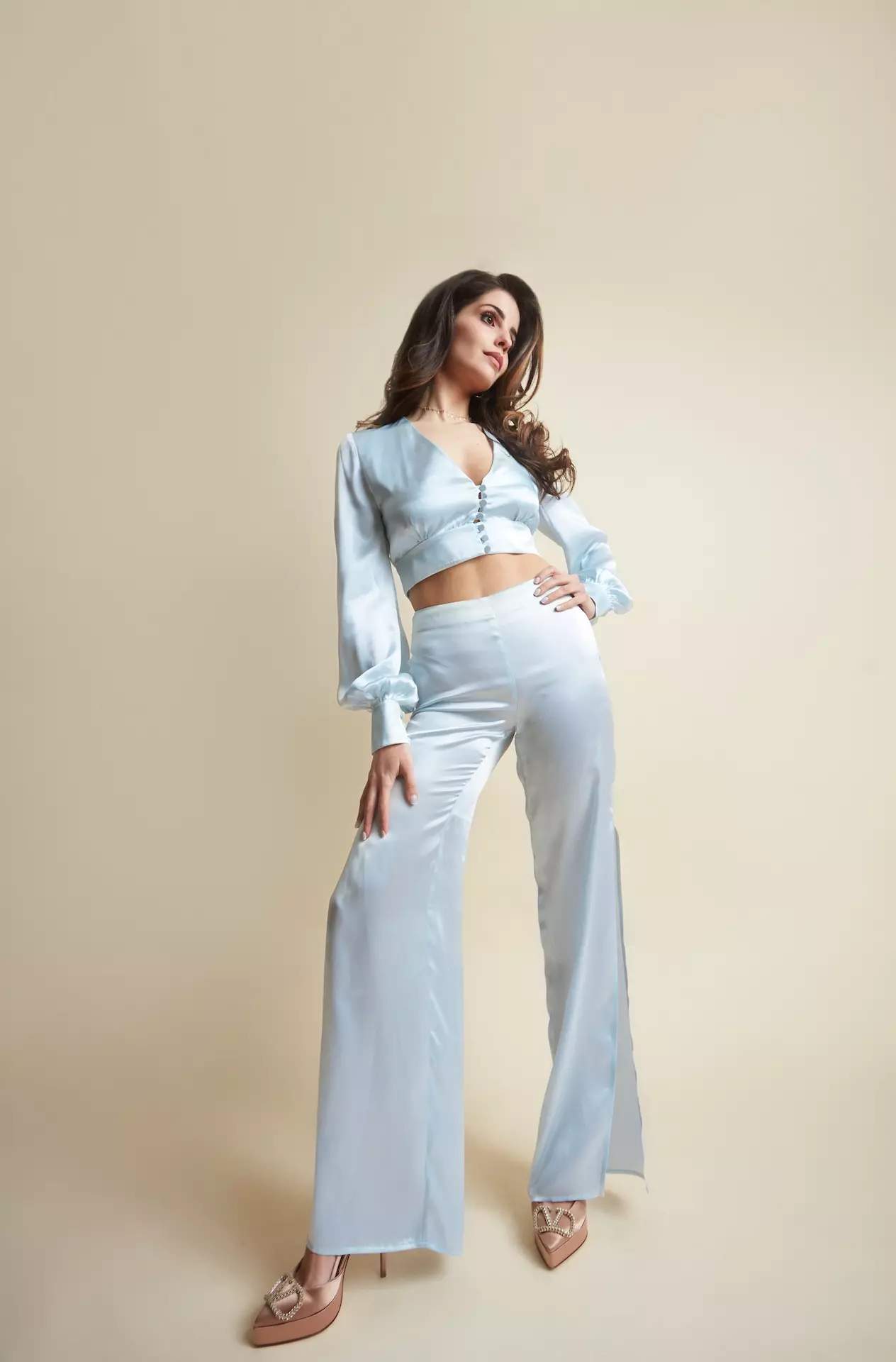 Cropped top revealing part of the waist. Deep V-neckline with covered buttons at the front. Long, voluminous sleeves cinched at the wrists for a sophisticated puffed effect.